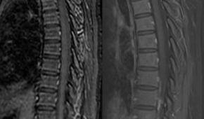 中肿骨软科挑战上胸椎多节段整块切除,再攀高峰来自阳江市的29岁女性患者,3个月前无明显诱因出现胸背部疼痛伴有双下肢乏力,无法行走,在当地医院行CT和MRI检查发现第2胸椎病变,为进一步诊治,患者和家属慕名来中肿就诊。 骨与软组织科王晋主任仔细查体和阅片后考虑第2胸椎肿瘤并不全瘫,为尽快制定治疗方案,王晋主任第一时间安排了透视定位下穿刺活检,病理证实为骨巨细胞瘤。由于该部位解剖结构复杂,加之该肿瘤较大,已突破骨质,形成软组织肿块,直接手术风险高且局部复发率也较高,王主任建议患者先行靶向药物狄诺塞麦治疗后,再行整块脊柱切除术。 经狄诺塞麦治疗4程后,复查CT和MR03-222019